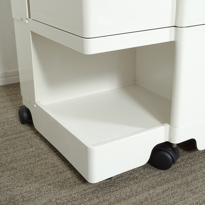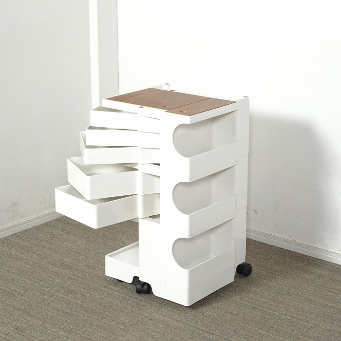 ボビーワゴンは、キャスター付きの本体を回転させることで側面4面すべてを効率的に使える、デザイン性と機能性に優れた収納家具です。