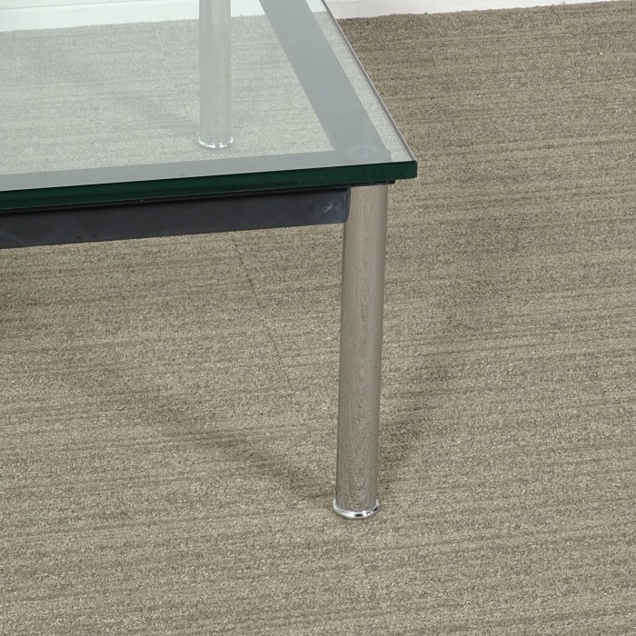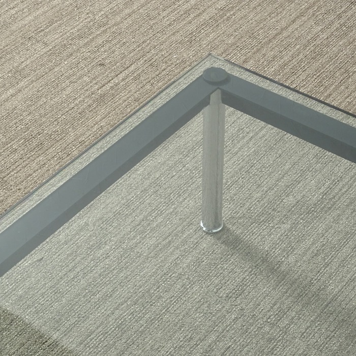 15mmのクリアーガラスとクロームメッキ仕上げのスティールパイプの脚、スティール塗装のフレームの3つの部材だけで構成されているシンプルなテーブル。