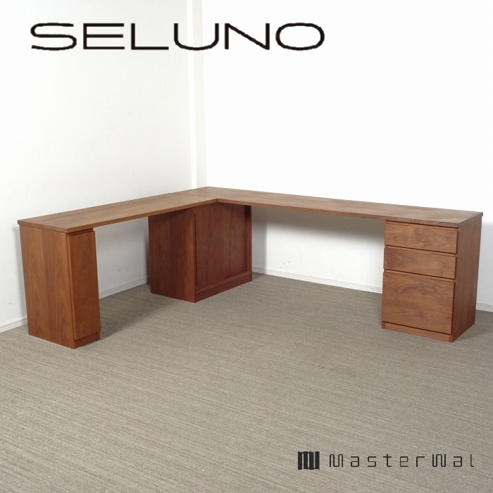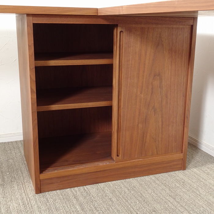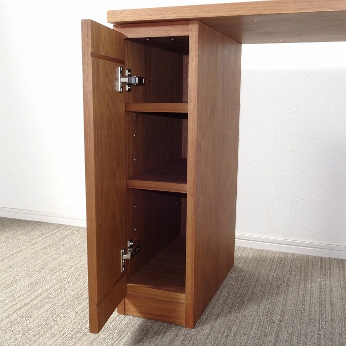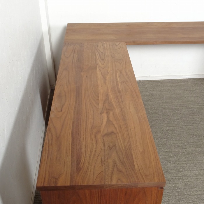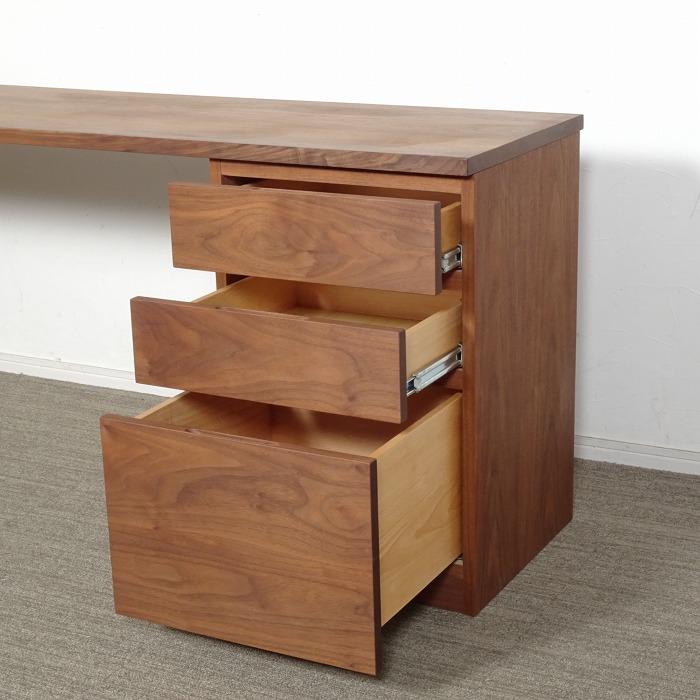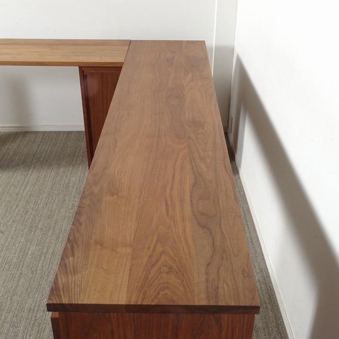 ウォールナット無垢の天板トップに、キャビネットやドロワーズを組み合わせたシンプルなシステムデスクです。